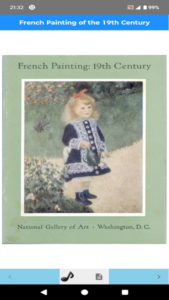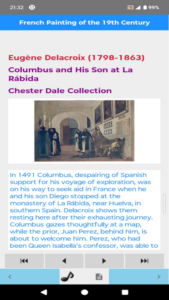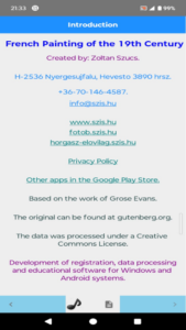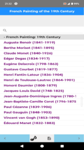 Introduction to French painters and their works, detailed description of each with a picture, background music that can be turned on/off.